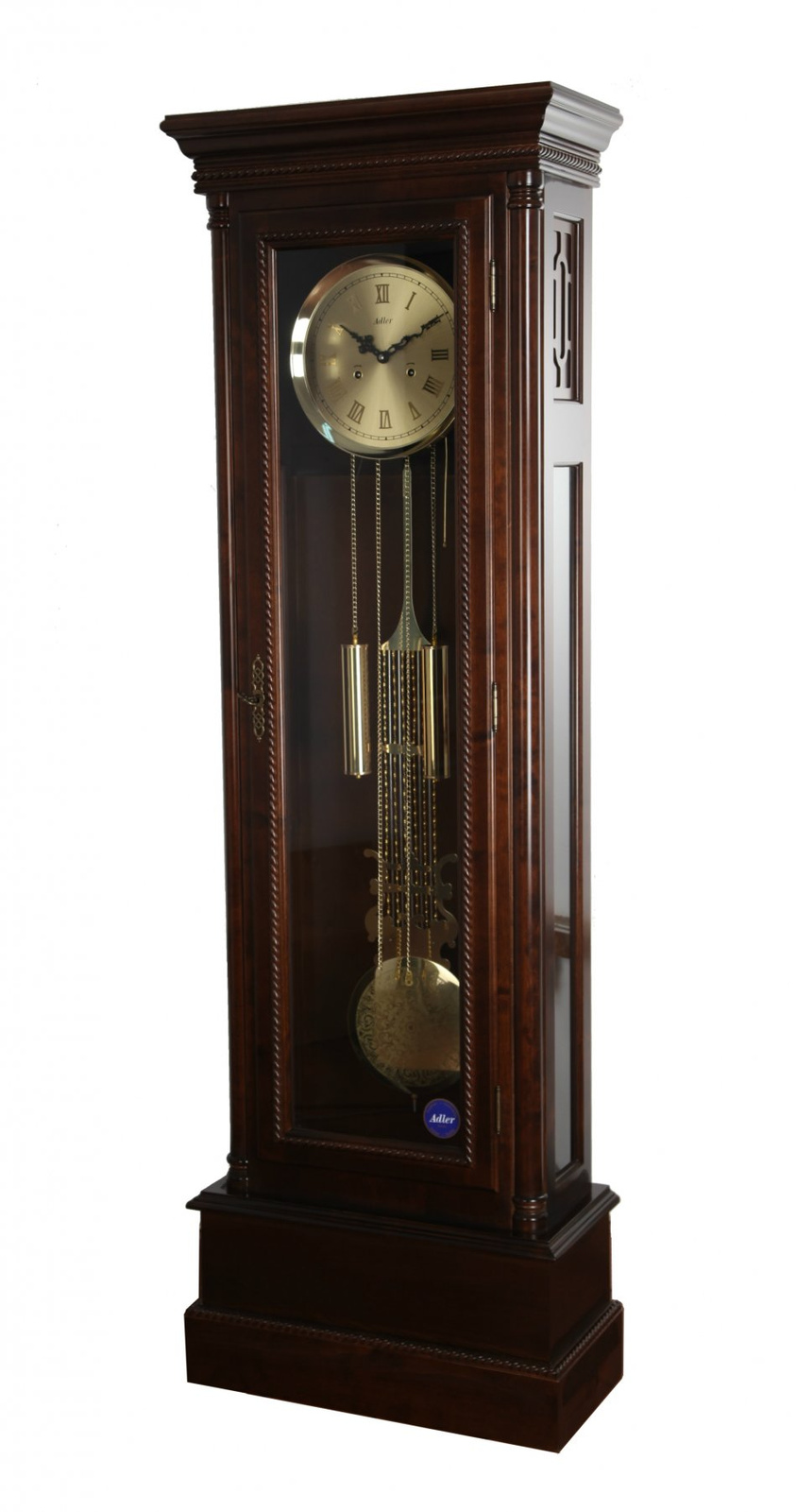Zegar stojący marki Adler, wykonany z litego drewna, napędzany jest tradycyjnym mechanizmem 31-dniowym. Pełni funkcję precyzyjnego czasomierza, a zarazem stanowi imponujący element wystroju wnętrza. Charakteryzuje się prostą, a jednocześnie interesującą formą o prostokątnym kształcie, z przeszklonym frontem i bokami. Uwagę przyciągają wysmakowane detale w postaci delikatnych plecionek otaczających szybę frontową oraz umieszczonych pod górnym belkowaniem i u dołu konstrukcji.