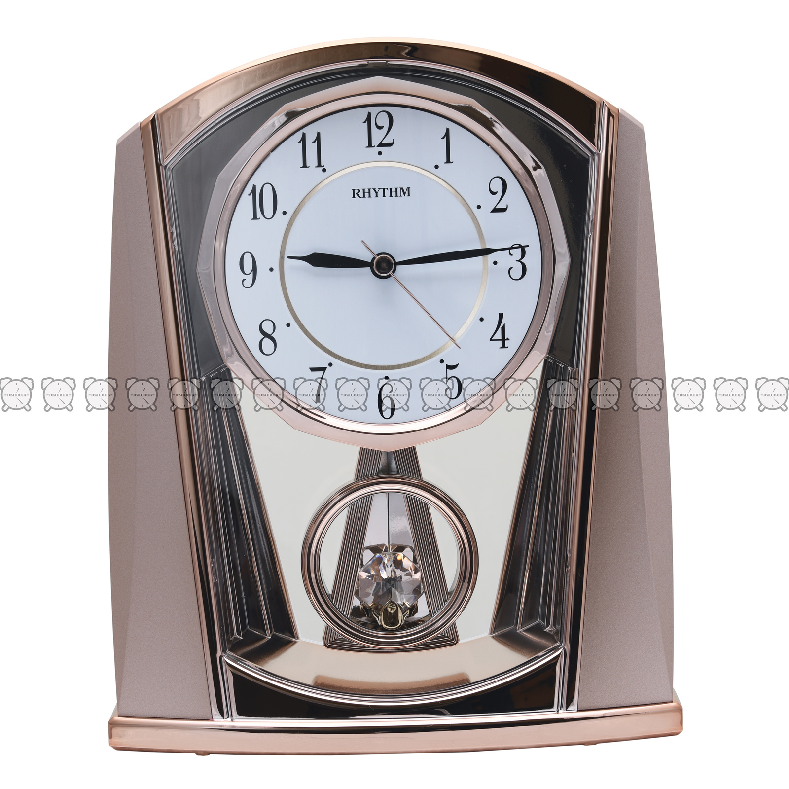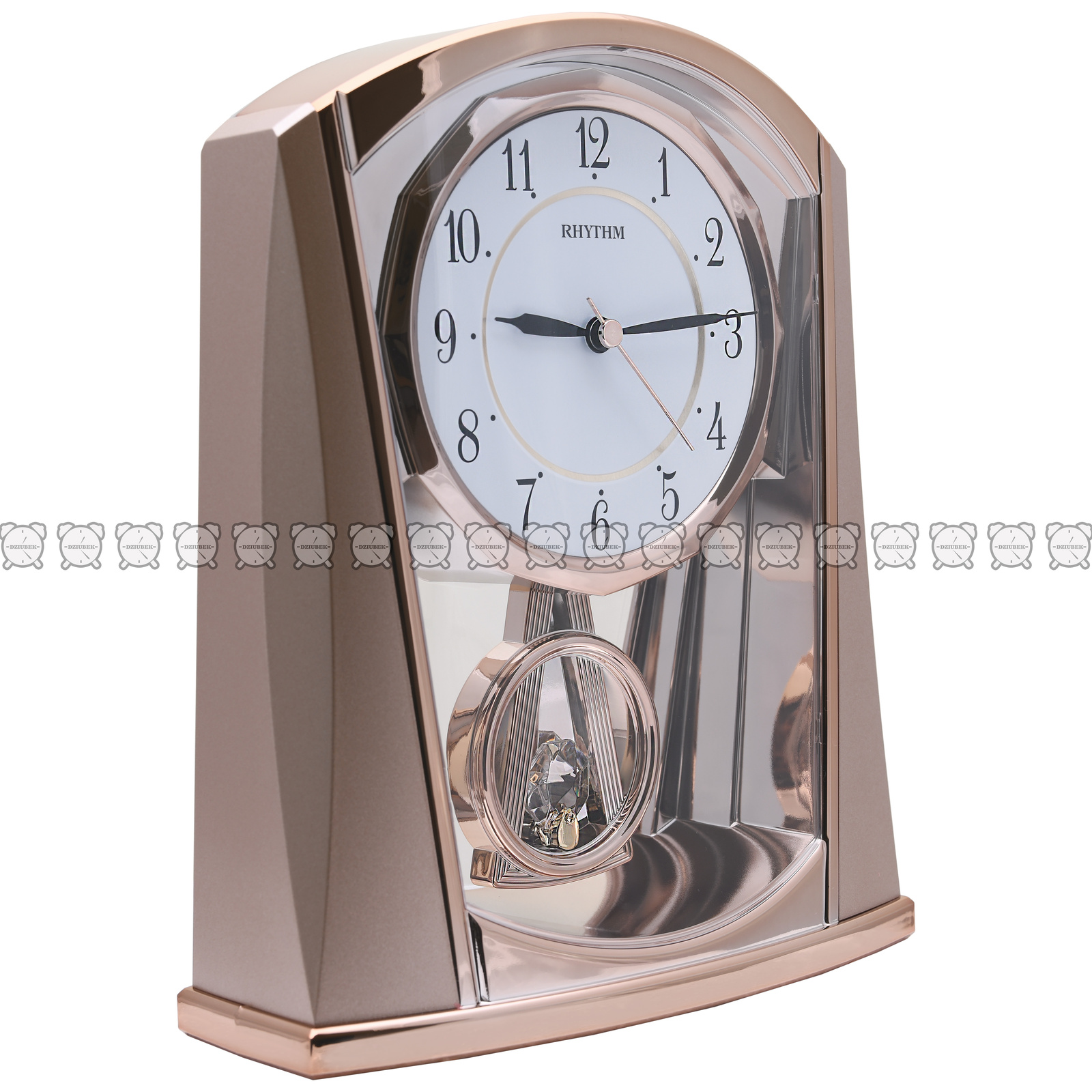 Zegar kwarcowy kominkowy z wahadłem w kolorze różowego złota, wykonany z plastiku. Zasilany bateriami R6 – 2szt.