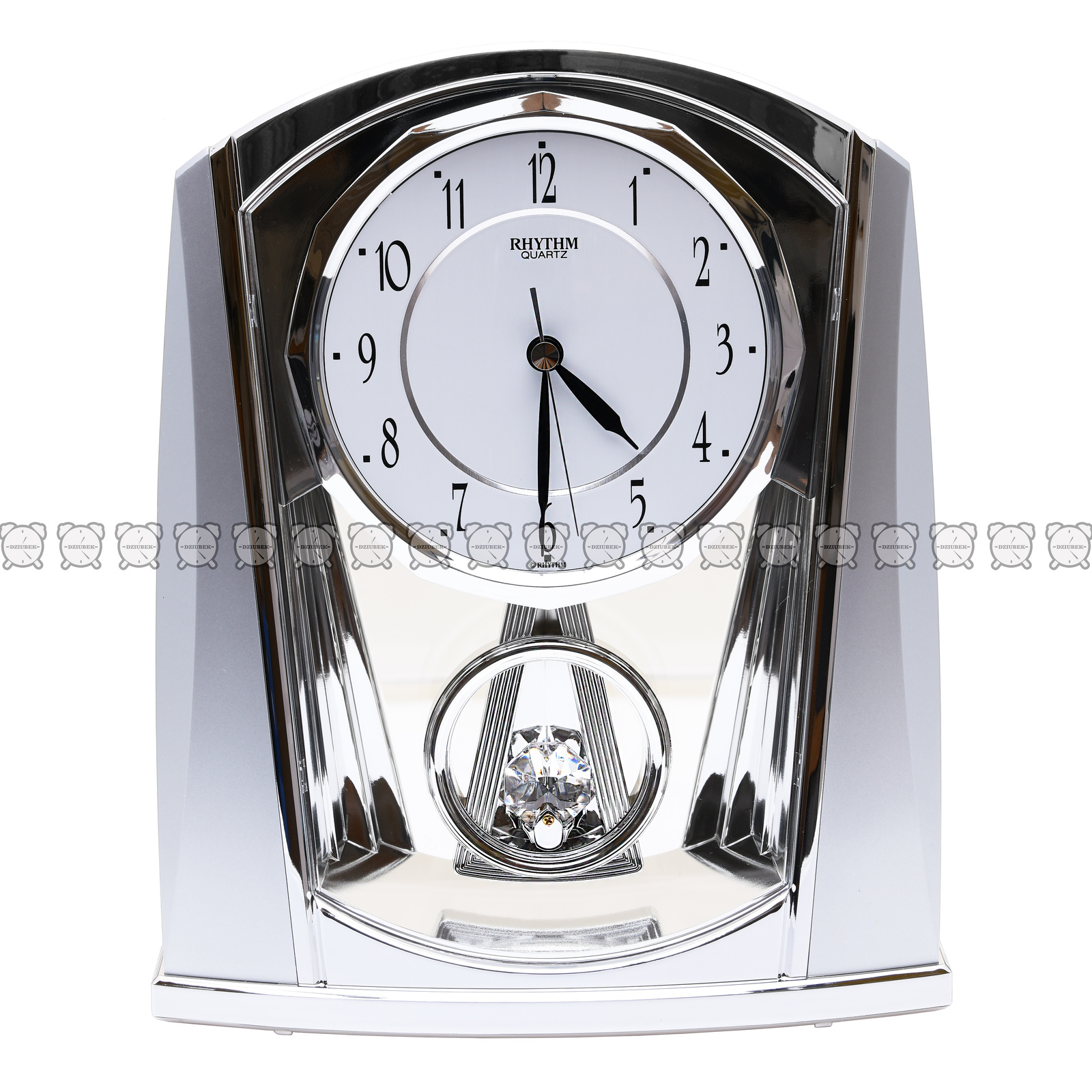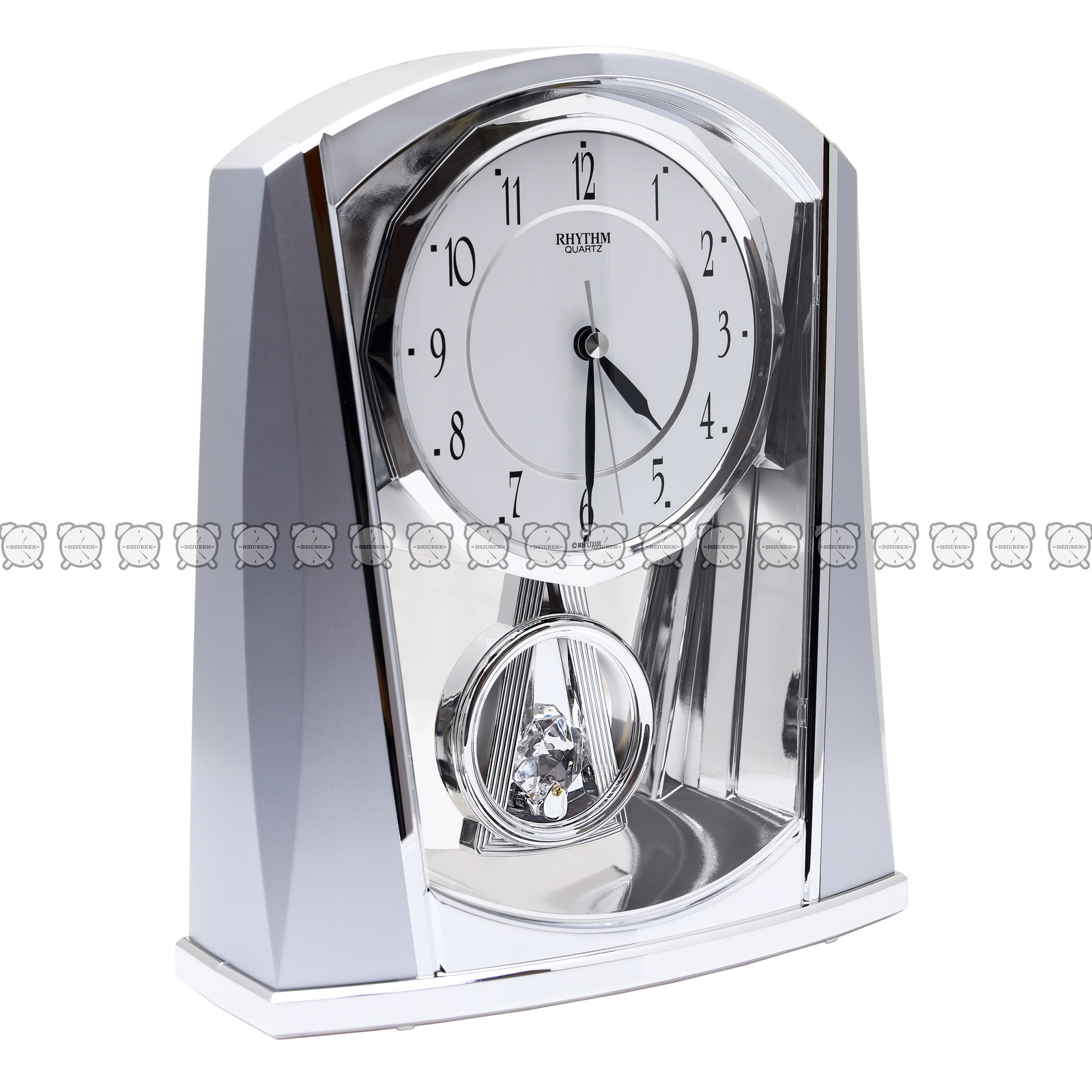 Nowoczesny zegar kwarcowy kominkowy z wahadłem zasilany bateriami R6. Zegar wykonany z wysokiej jakości tworzywa sztucznego w kolorze srebrnym.