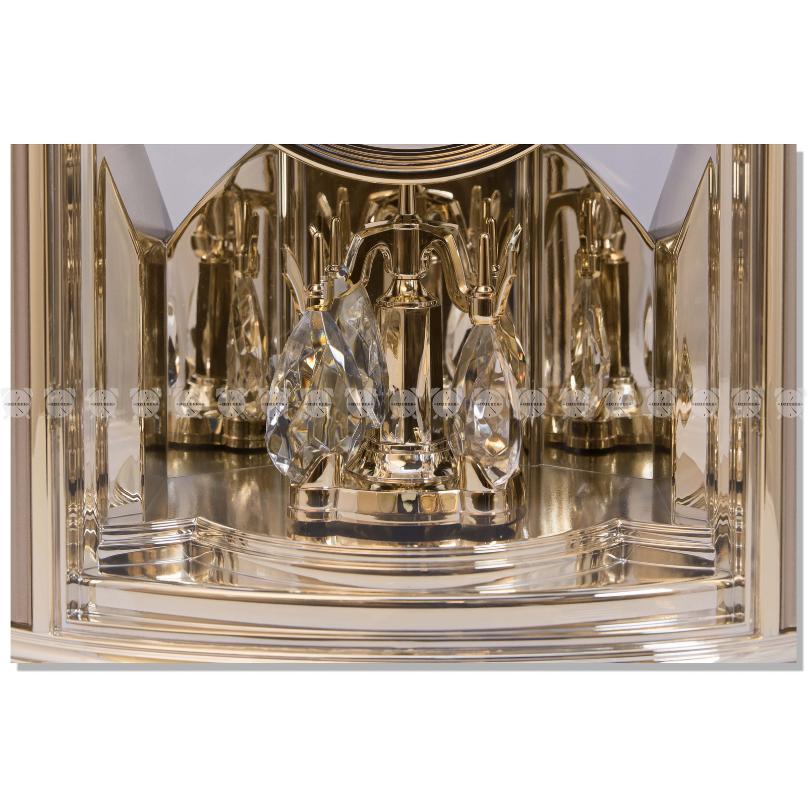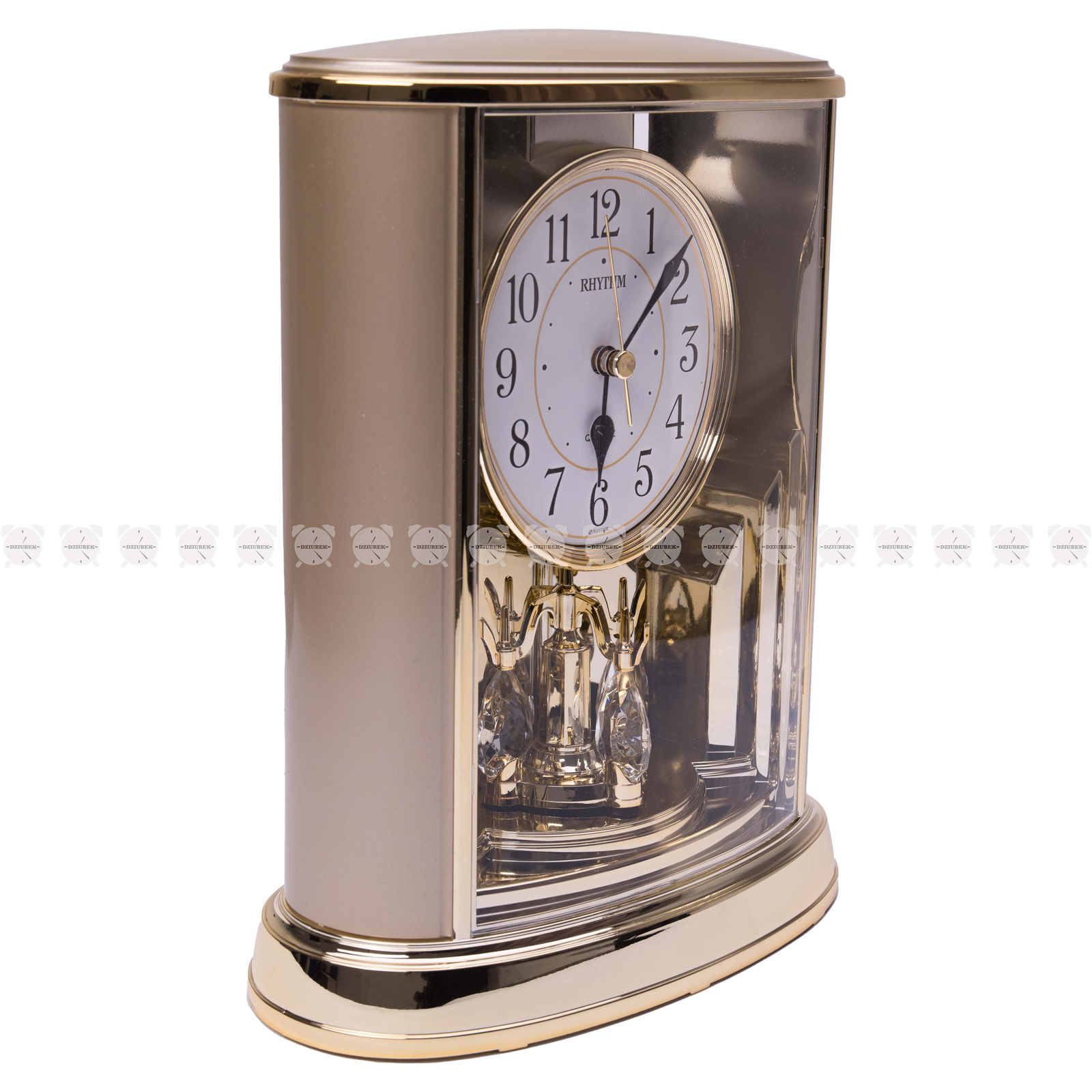 Piękny, nietuzinkowy zegar kominkowy z wirującym wahadełkiem japońskiej firmy Rhythm. Wykonany z wysokiej jakości tworzywa sztucznego, cały w kolorze złotym, posiada mechanizm kwarcowy.