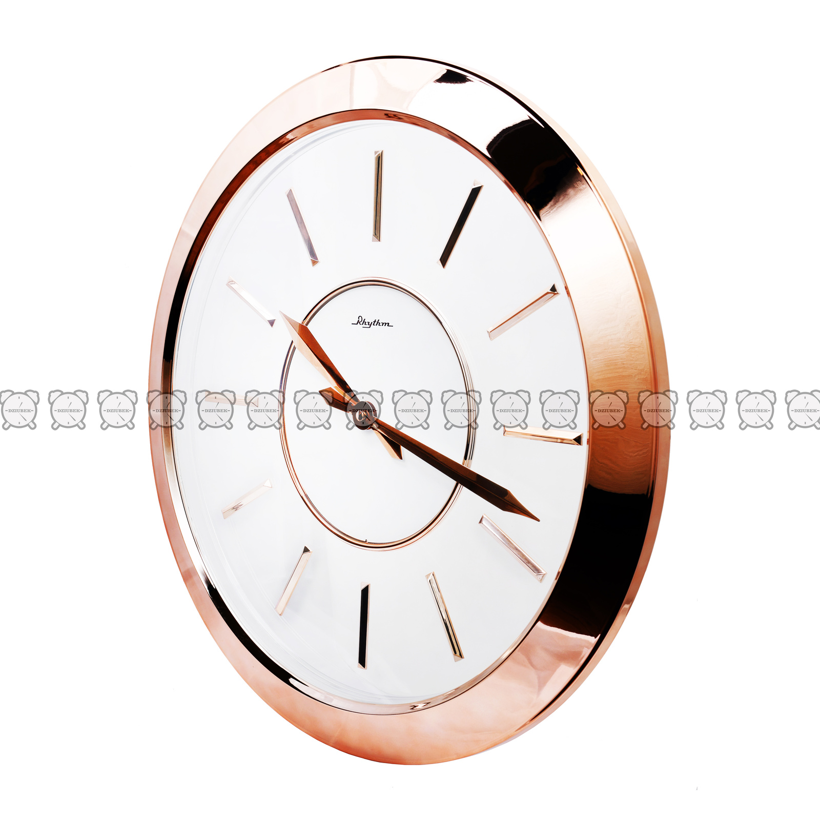 Zegar wiszący o średnicy 51 cm w kolorze różowego złota. Okrągły, tarcza w kolorze kremowym a na niej proste indeksy w kolorze obudowy zegara. Zasilany jedną baterią R6. Nowoczesny, minimalistyczny design wkomponuje się w niejedno wnętrze.
