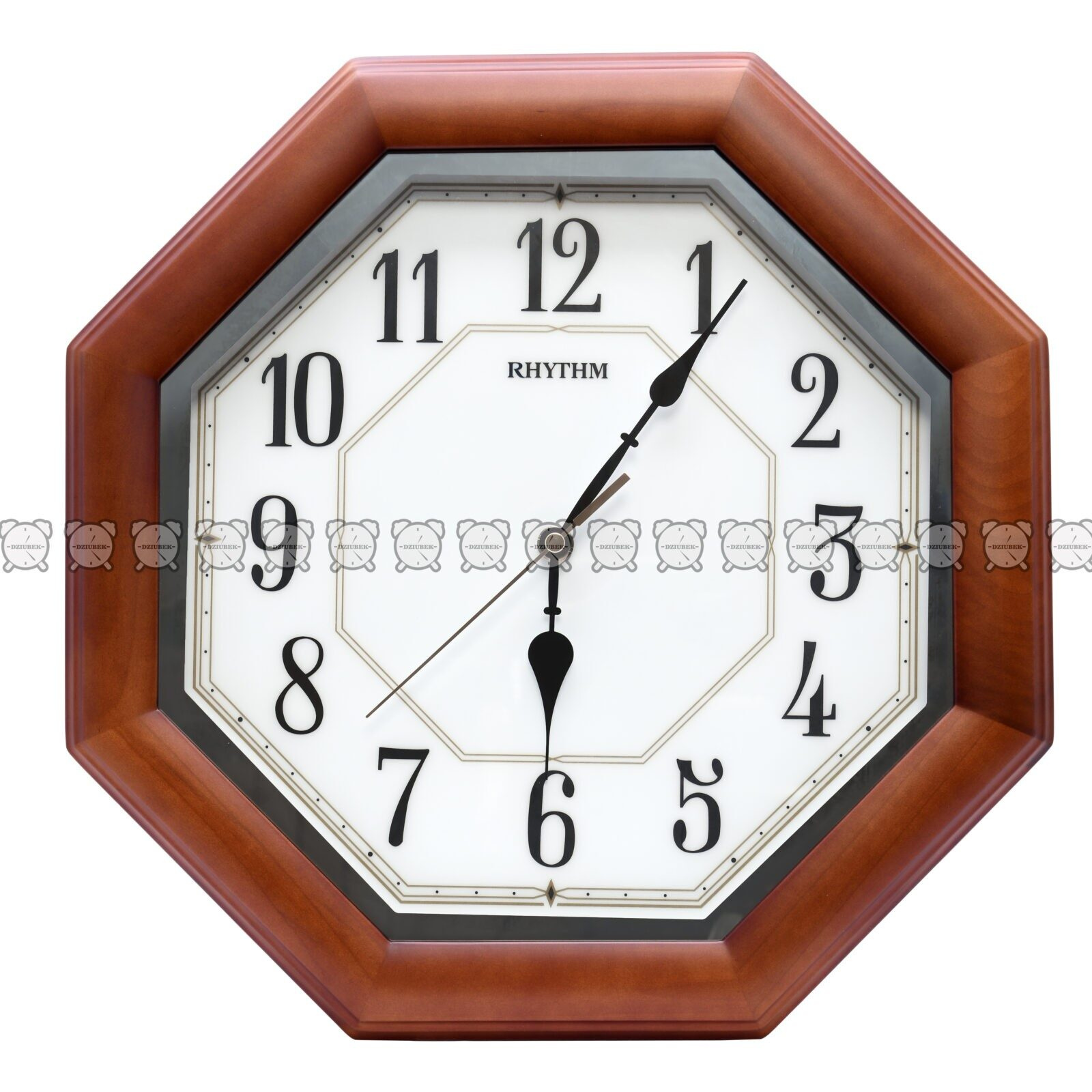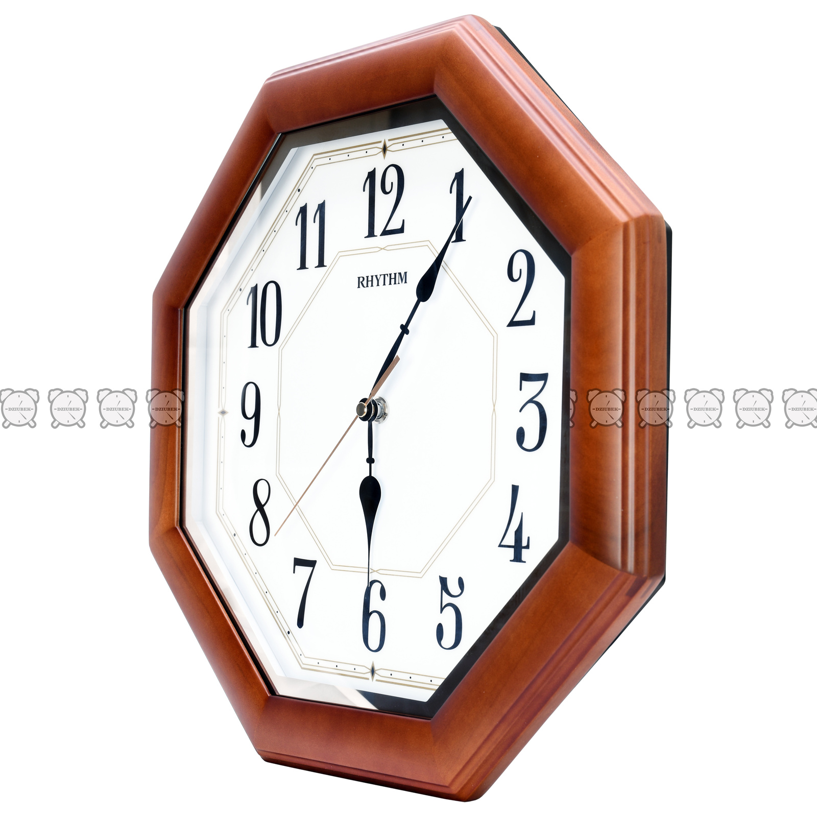 Zegar kwarcowy w drewnianej obudowie o ciekawym kształcie ośmiokąta w kolorze jasnego brązu. Tarcza zegara w kolorze jasnym z czarnymi cyframi arabskimi.