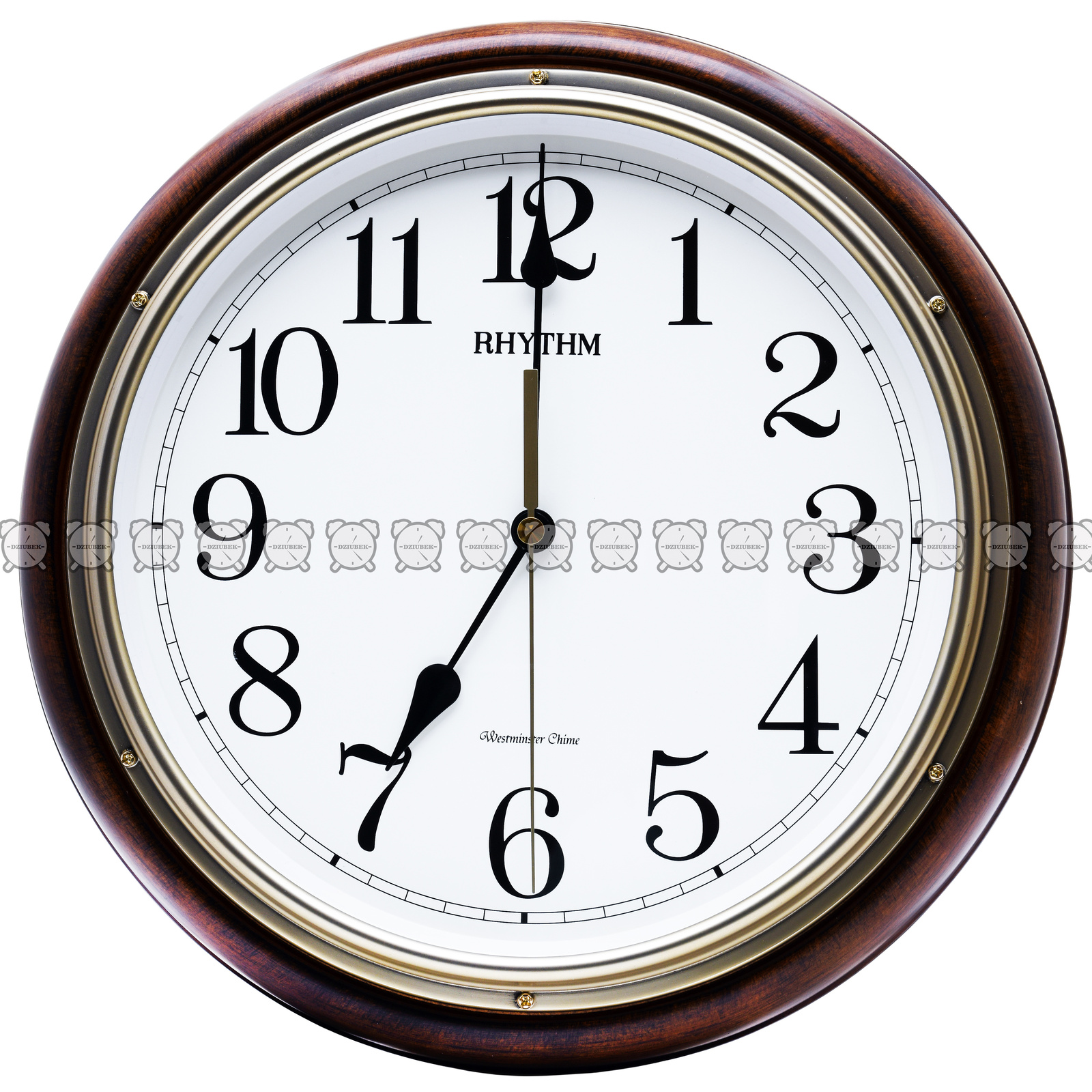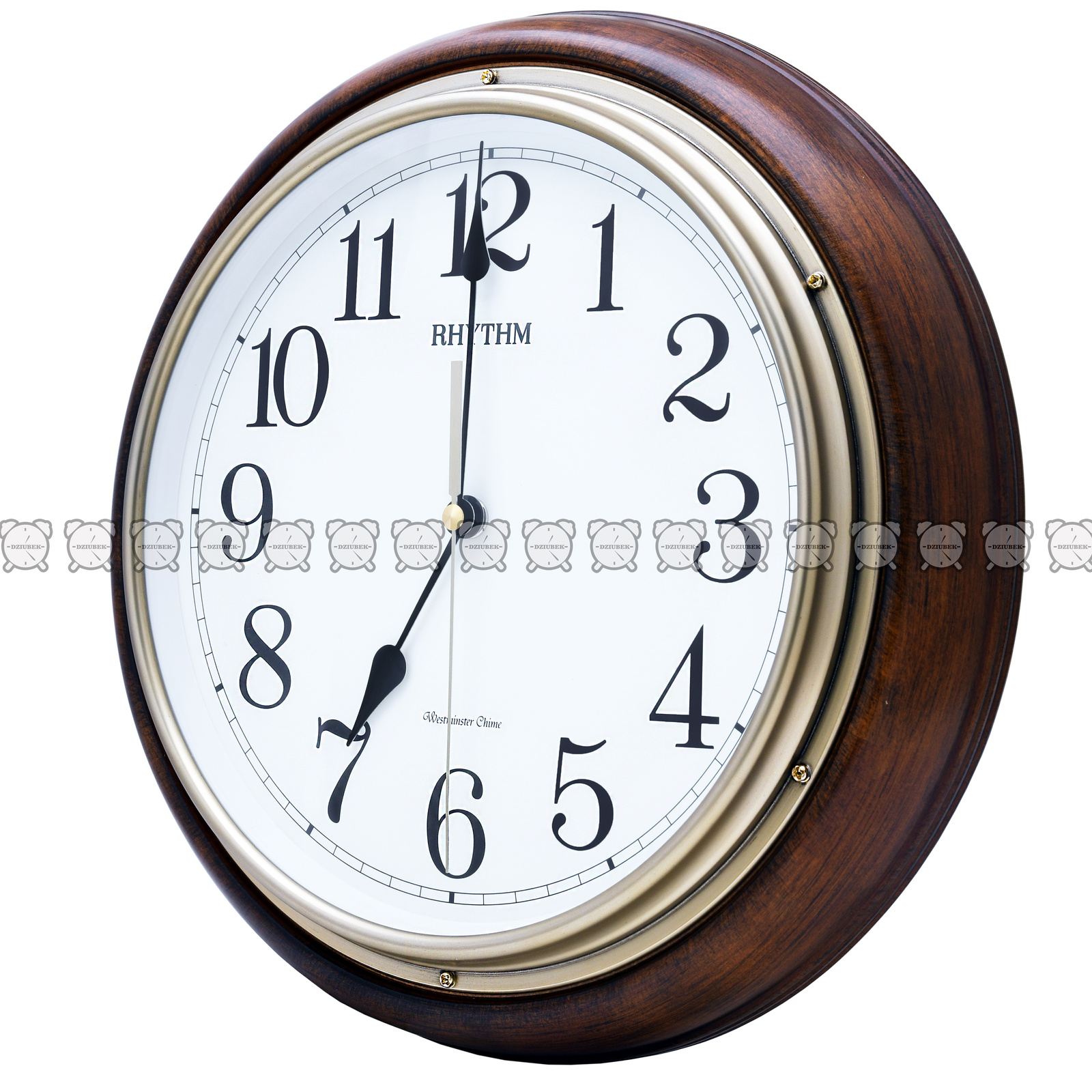 Klasyczny, okrągły zegar w drewnianej obudowie japońskiej firmy Rhythm. Zegar z mechanizmem kwarcowym zasilany dwoma bateriami R14. O pełnej godzinie bije i wygrywa melodie Westminster lub jedną z 6 różnych melodii bądź jedną z 3 kolęd.