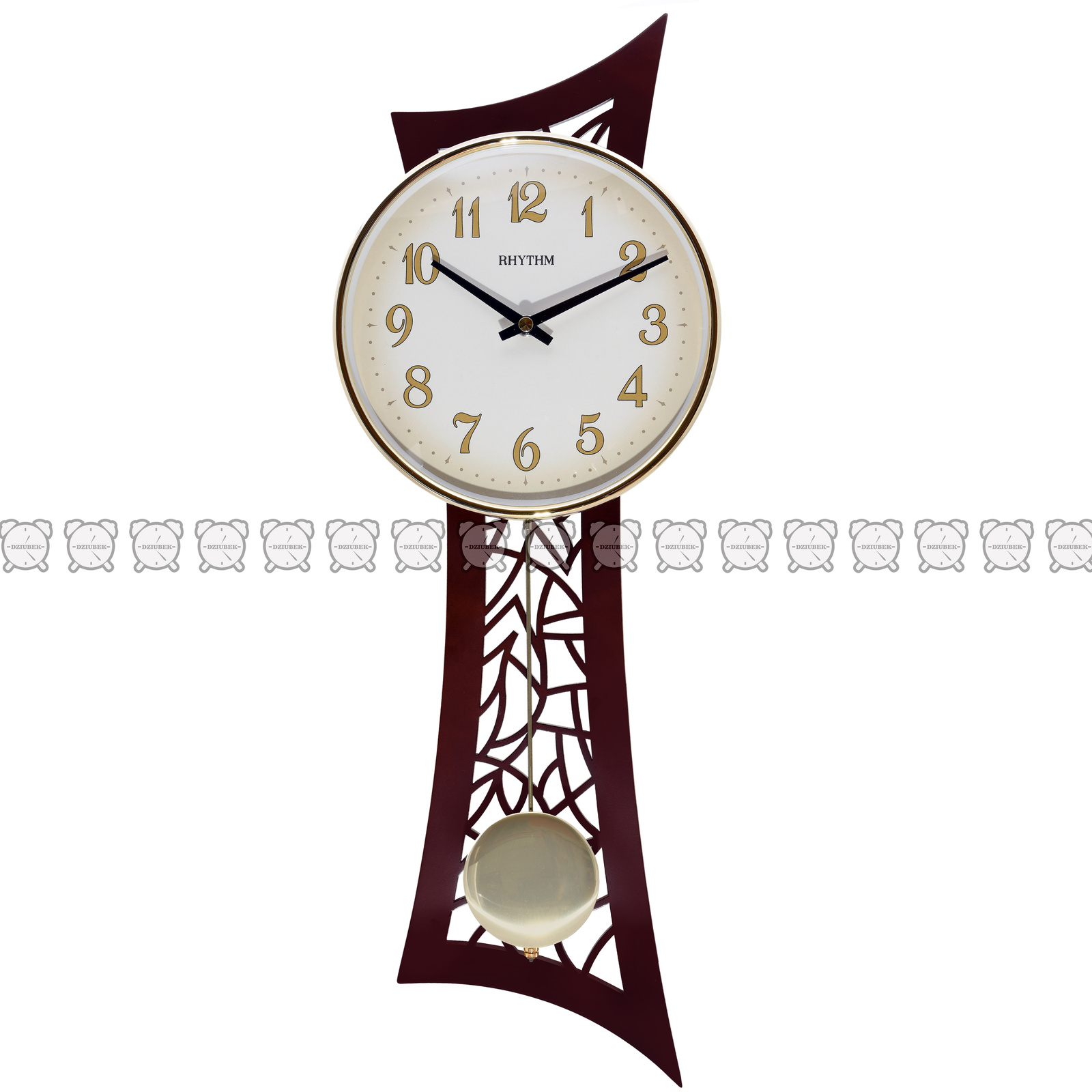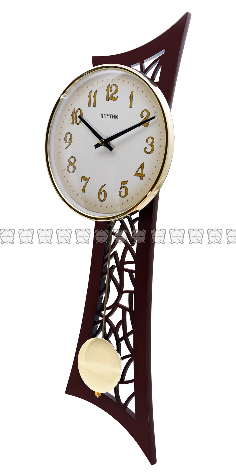 Nietuzinkowy nowoczesny zegar kwarcowy z okrągłą tarczą, umocowaną na niesymetrycznej drewnianej deseczce w ażurowy wzór oraz ruchomym wahadłem. Zasilany na baterie R6 -2szt. Tarcza umieszczona w złotej obudowie z tworzywa sztucznego. Cyfry arabskie w kolorze złotym odznaczają się na kremowym cyferblacie.