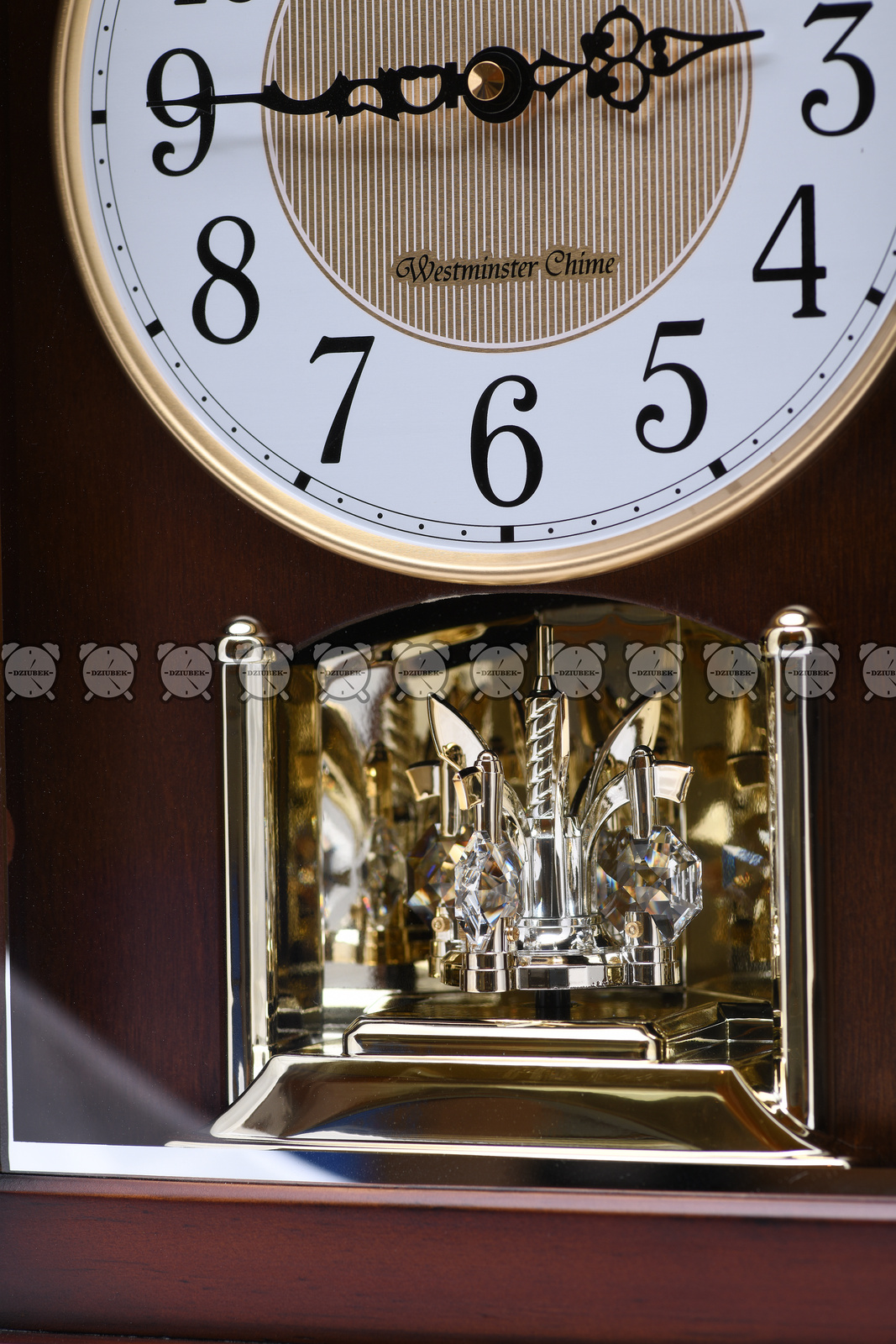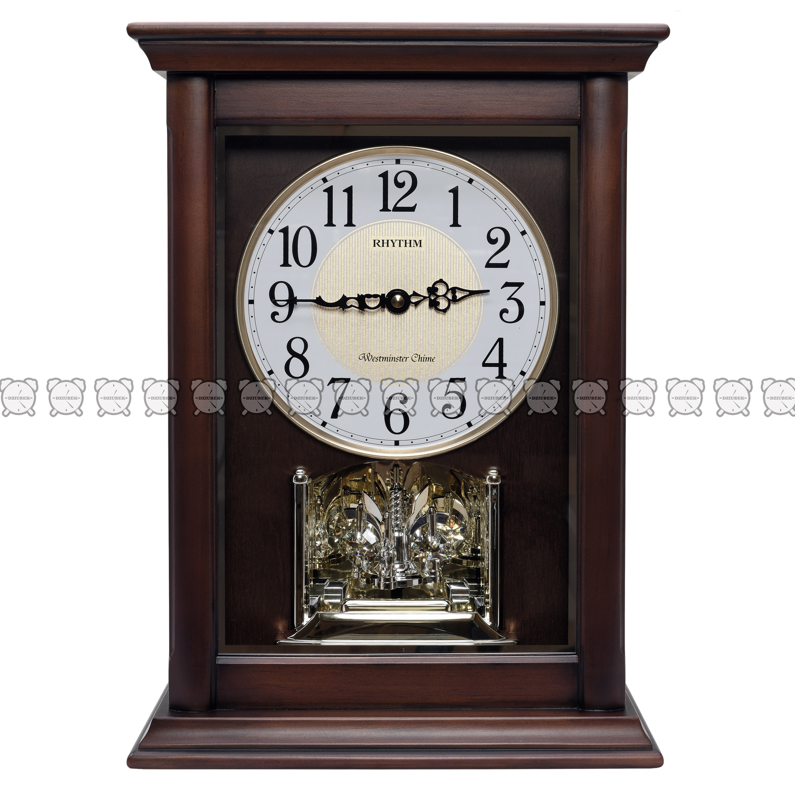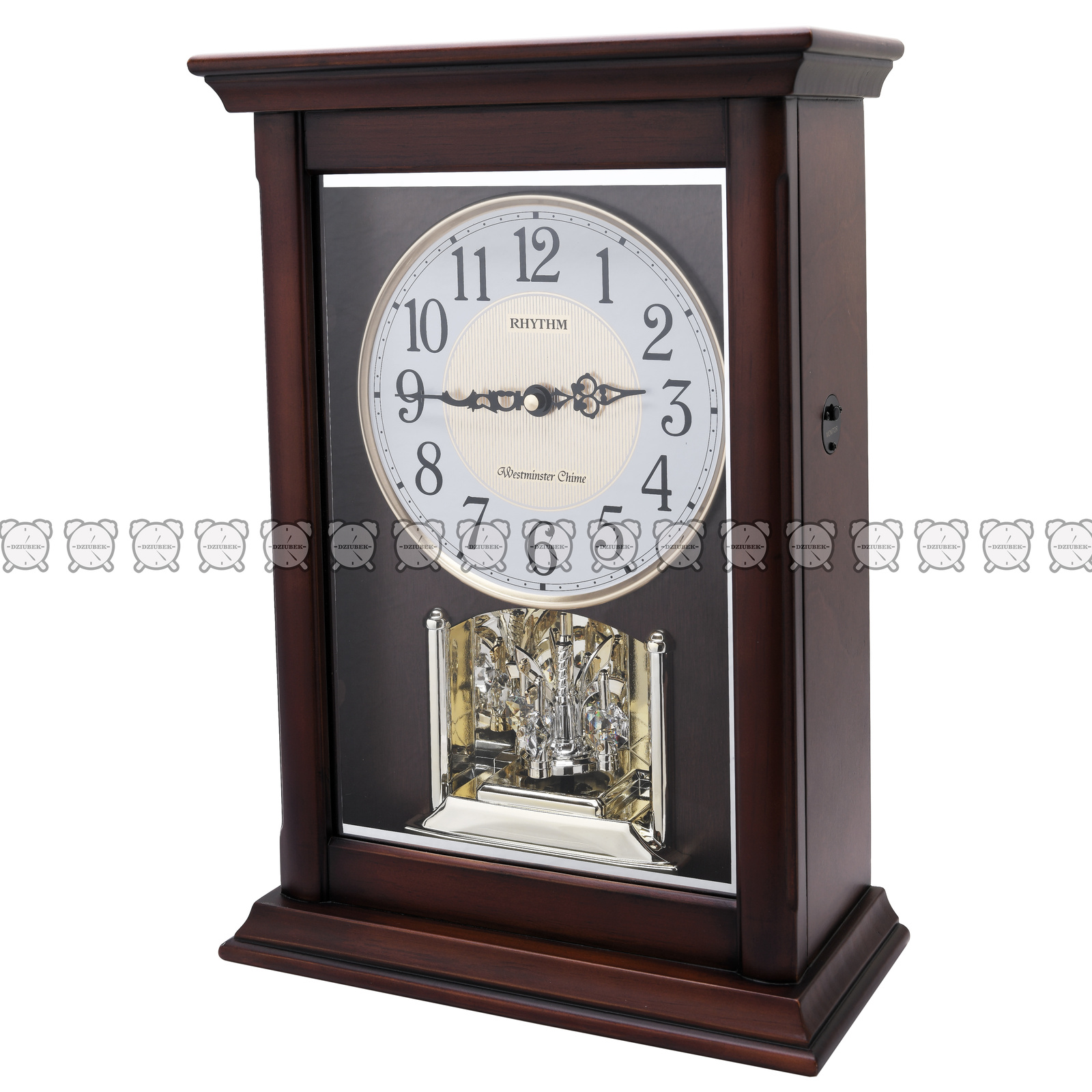 Klasyczny zegar kominowy drewniany z biało złotą tarczą na której znajdują się czarne cyfry arabskie. Precyzyjny mechanizm japońskiej firmy Rhythm zasilany bateriami R14 i R6. Kurant wygrywa 16 melodii, 3 kolędy, Westminster oraz Westminster co kwadrans.