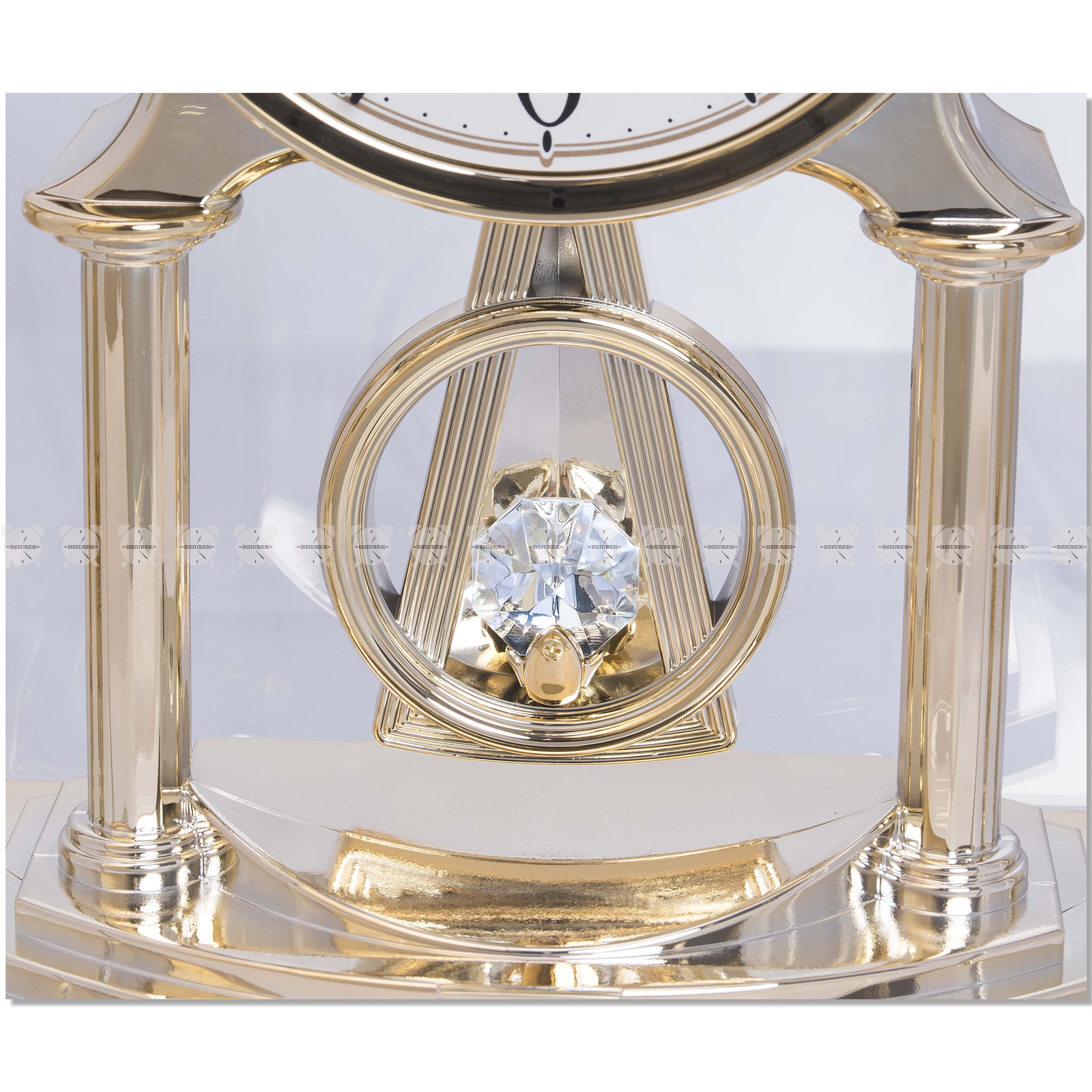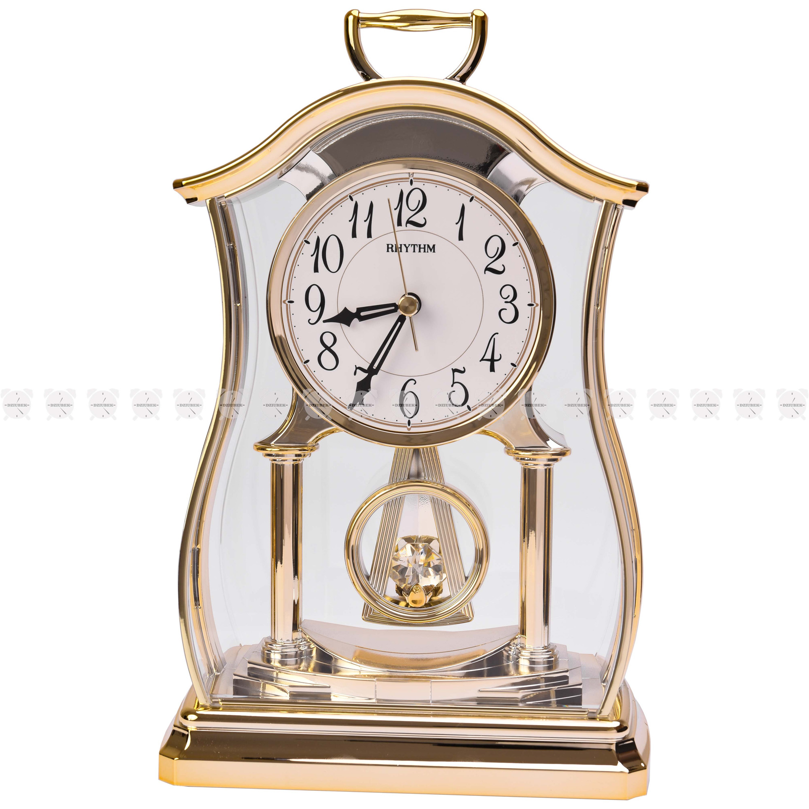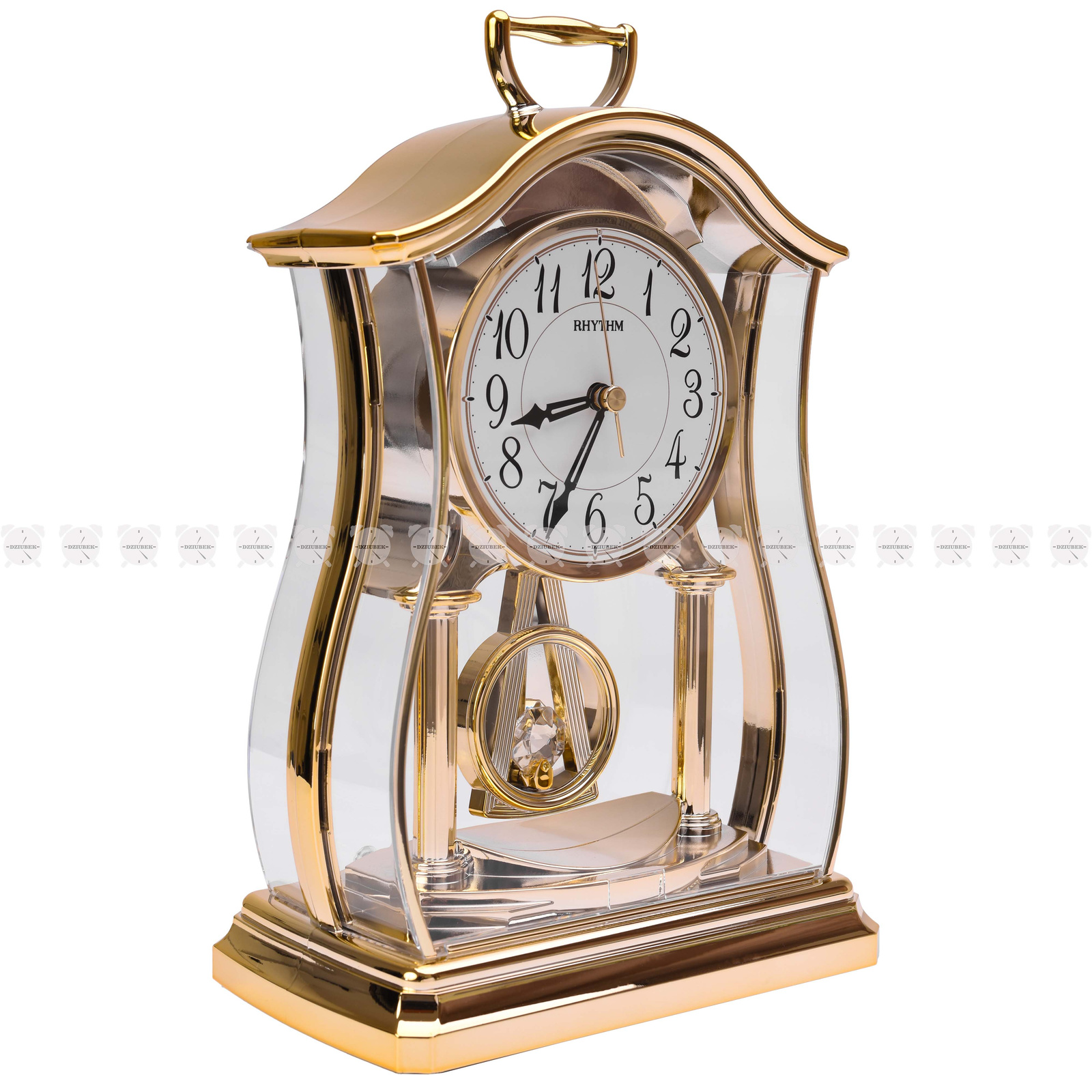 Uroczy zegar kominkowy japońskiej firmy Rhythm. Obudowa z tworzywa sztucznego połączona ze szkłem, w pięknym kolorze złota. Idealnie sprawdzi się we wnętrzach nowoczesnych jak i klasycznych, gdzie wśród dodatków króluje złoto.