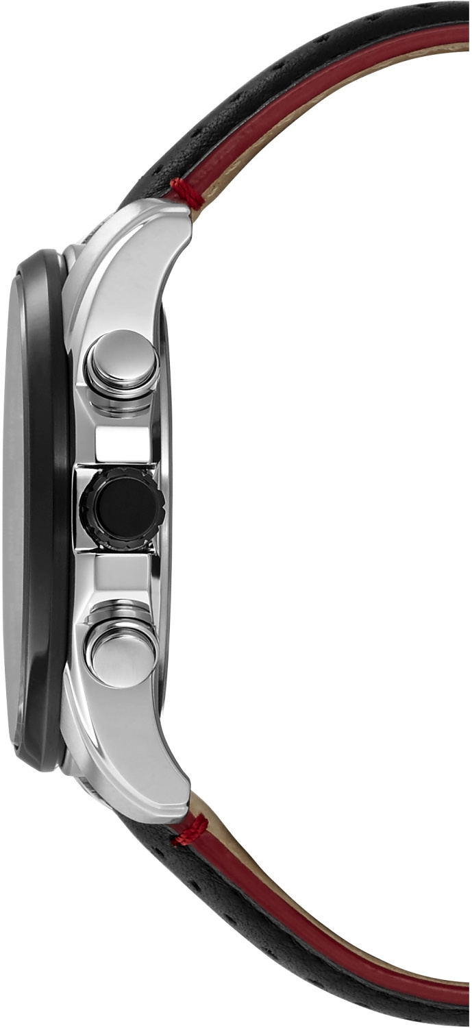 Na pierwszy plan wysuwa się solidna koperta ze stali szlachetnej w srebrnym kolorze, zestawiona z głęboką czernią tarczy oraz skórzanego paska z delikatnymi czerwonymi akcentami. Takie zestawienie nadaje zegarkowi nowoczesny, ale wciąż klasyczny charakter. Tarcza chroniona jest przez szafirowe szkło, odporne na zarysowania, które zapewnia krystalicznie czysty widok na wskazania czasu.