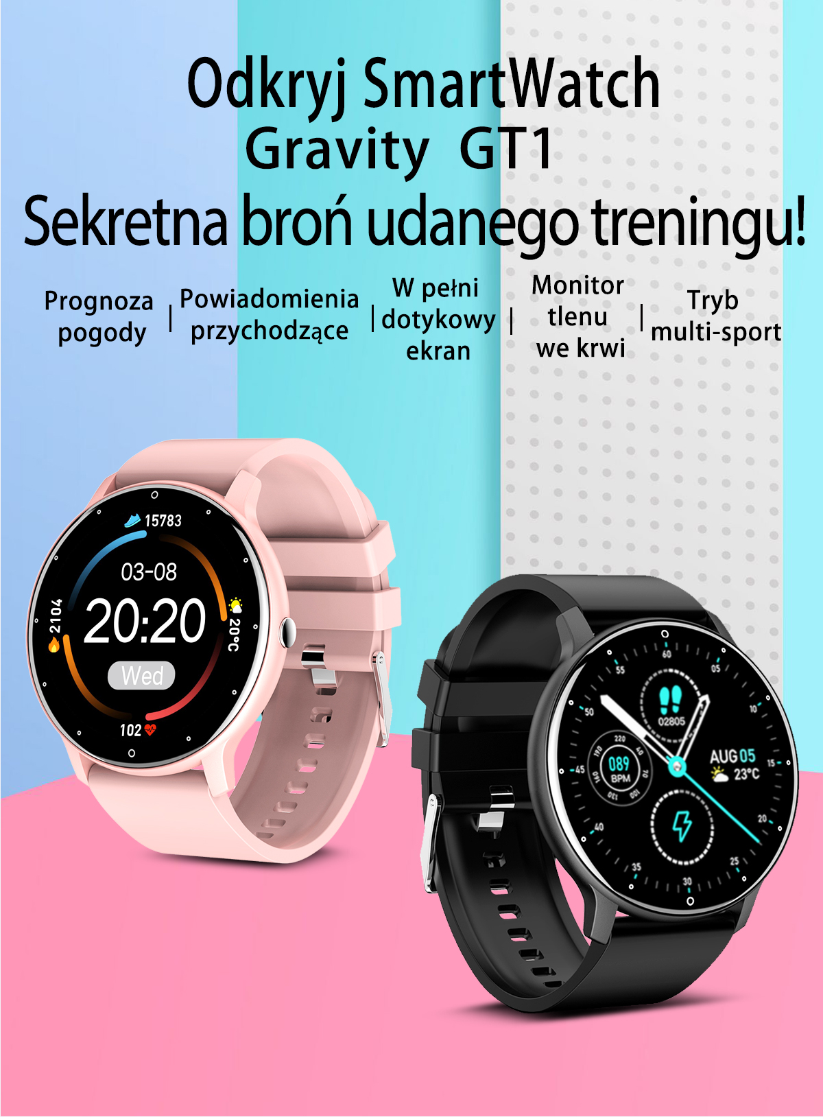- Smartwatch Gravity GT1 – nowoczesny design i zaawansowane funkcje w przystępnej cenie. Idealny do codziennego użytku – monitoruje aktywność, tętno i sen.