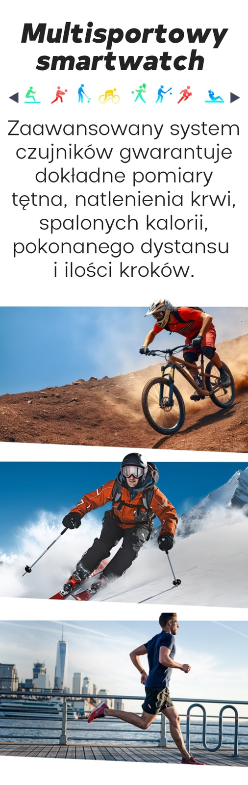 Tryb multisport: | Spacer, bieg, jazda rowerem, Skoki, badminton, koszykówka, piłka nożna, siatkówka i wiele innych |