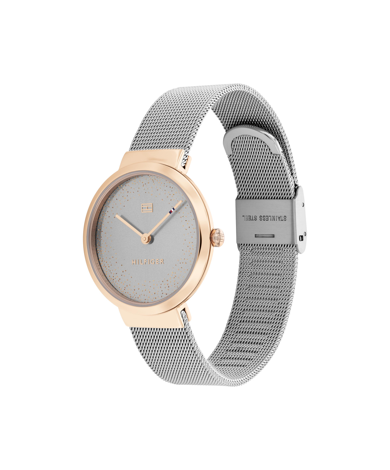- Tommy Hilfiger 1782467 – damski zegarek w minimalistycznym stylu z kopertą w odcieniu różowego złota i srebrną bransoletą mesh. Szara tarcza, mechanizm kwarcowy i wodoszczelność 30 m. Elegancki i uniwersalny dodatek do każdej stylizacji.