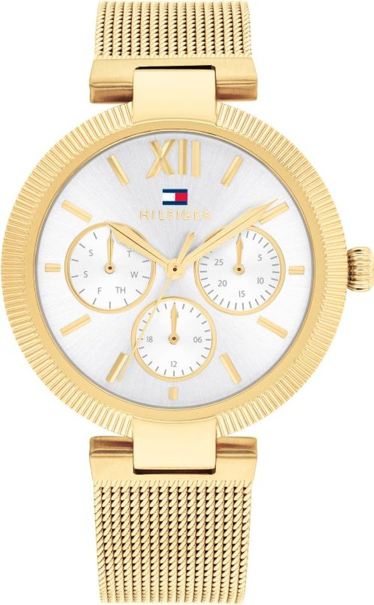 Tommy Hilfiger 1782694 to damski zegarek, który łączy elegancję biżuteryjnego dodatku z funkcjonalnością na co dzień. Okrągła koperta o średnicy 36 mm i grubości 8 mm, wykonana ze stali szlachetnej w złotym kolorze, przyciąga uwagę subtelnym blaskiem i smukłą linią. Srebrna tarcza, ozdobiona mieszanymi indeksami, tworzy harmonijną całość, którą uzupełniają praktyczne subtarcze – wskaźnik dnia tygodnia, datownik oraz format 24-godzinny.