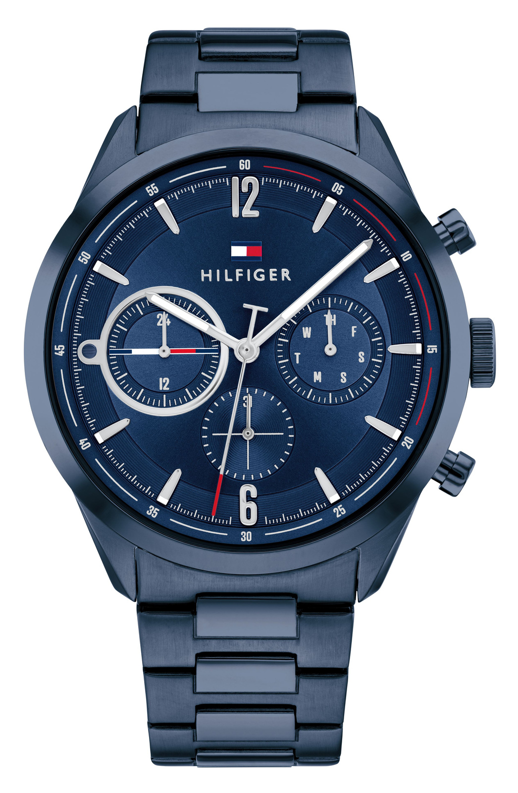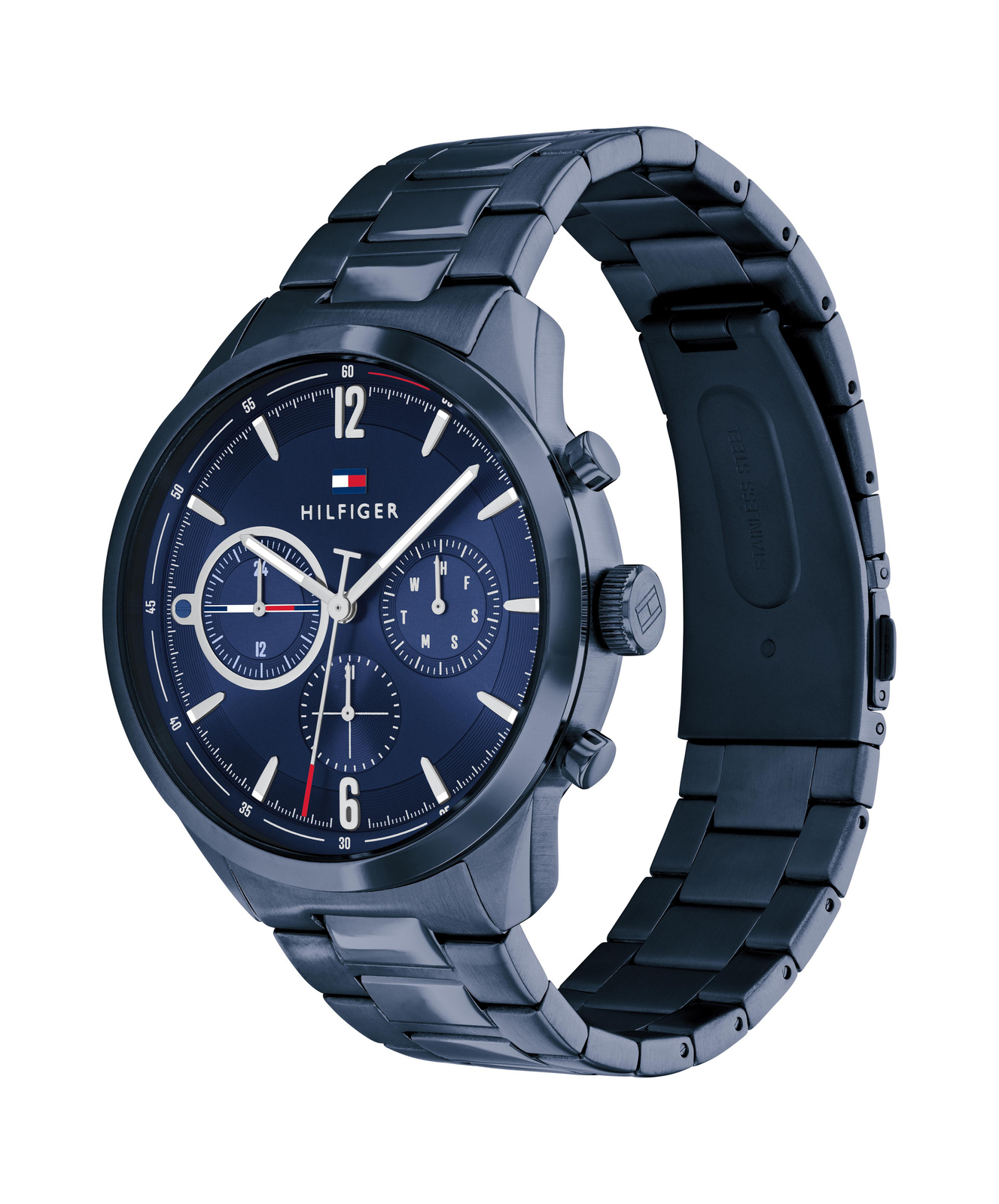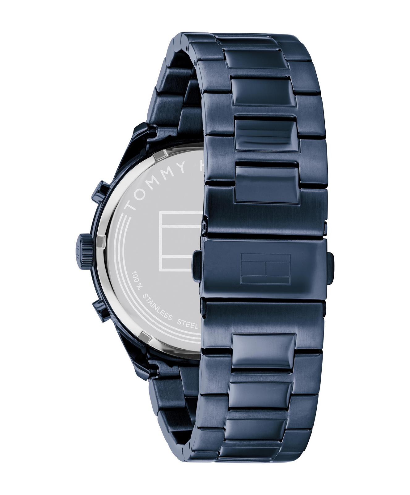 Tommy Hilfiger 1791945 to męski zegarek, który łączy sportową energię z elegancją charakterystyczną dla stylu fashion. Okrągła koperta o średnicy 44 mm, wykonana ze stali szlachetnej w granatowym kolorze, tworzy spójną całość z dopasowaną stalową bransoletą, utrzymaną w tym samym odcieniu. Wyrazista forma i głęboka tonacja nadają modelowi nowoczesny, a zarazem ponadczasowy charakter.