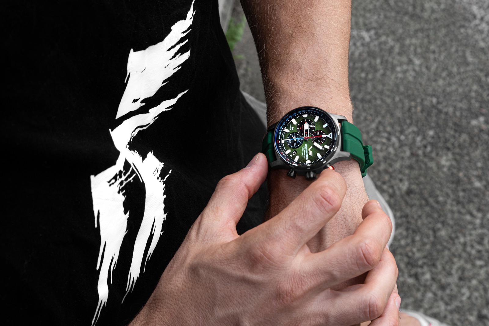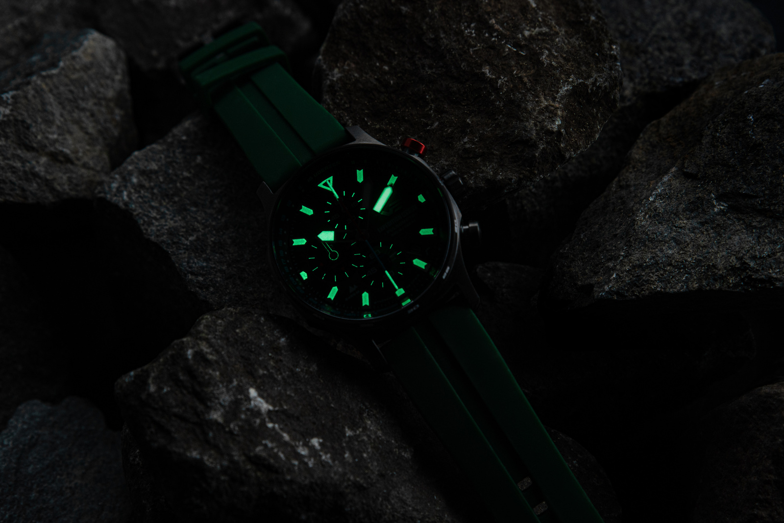 Na tarczy znajdziesz funkcjonalny chronograf, datownik oraz wyraźne indeksy i wskazówki pokryte masą Super-LumiNova, które gwarantują doskonałą czytelność w każdych warunkach. Wewnętrzna skala pulsometru i skala oddechowa podkreślają jego terenowy, ekspedycyjny charakter.
